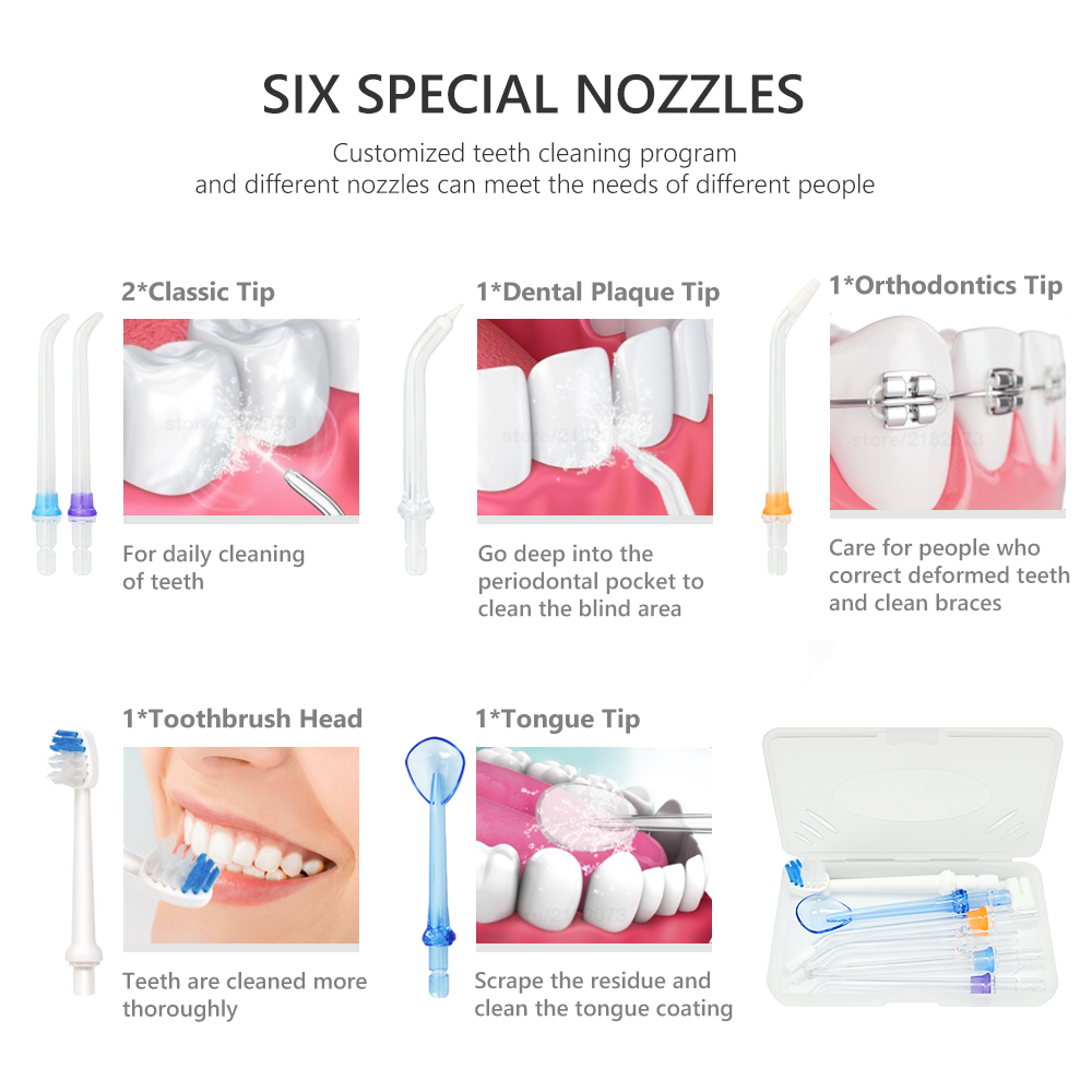 Irrigateur dentaire + 6 têtes de remplacement + manuel + câble de charge * 1 ensemble